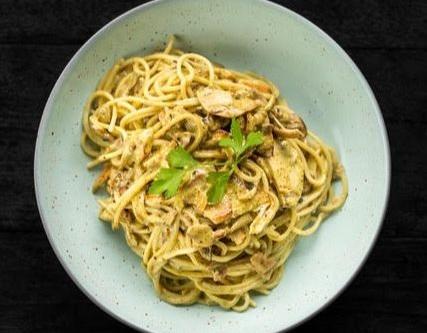 Chicken, Mushroom, Onion, Pine Nuts, Pesto, Moselle, Parmesan, & Garlic Cooked in Cream Sauce