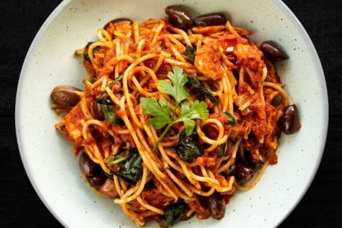 Semi Dried Tomatoes, Black Olives, Onion, Spinach with Napoletana Sauce